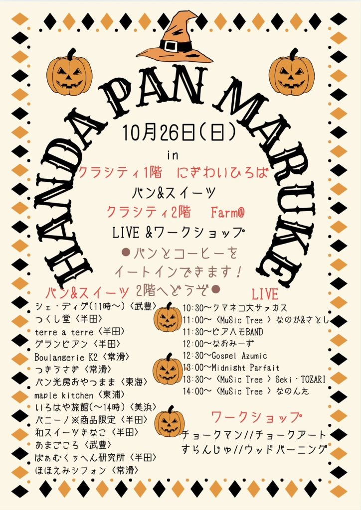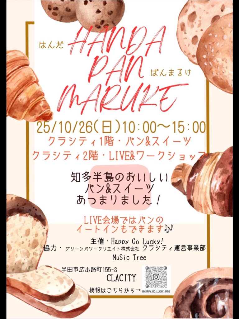 HANDA PAN MARUKE 2025 10/04 お知らせ 2025年10月4日 10月26日(日)10:00~15:00にクラシティにて「HANDA PAN MARUKE(はんだぱんまるけ)が開催されます!!!!そちらに美浜町から「いろはや旅館」さんが出店します(^▽^)/ぜひ足を運んでください☆ お知らせ