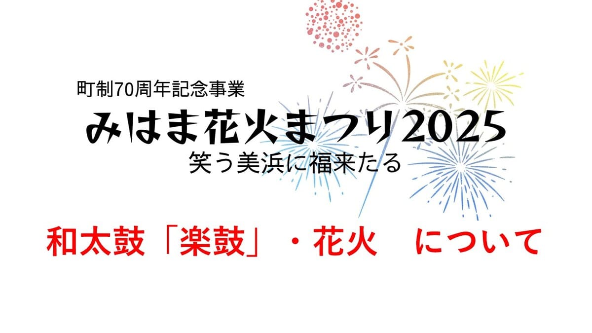 みはま花火まつり2025 ※和太鼓と花火について 2025 10/10 お知らせ 2025年10月10日 和太鼓「楽鼓」につきましては、雨天中止となります。 花火につきましては、少量の雨天の場合決行予定ですが正式な決定は12時以降となります。 12時30分現在、花火開催予定。 ホームページ、Instagramでご確認ください。 お知らせ