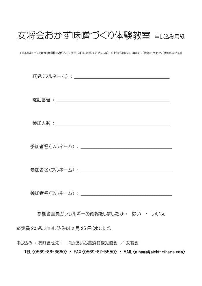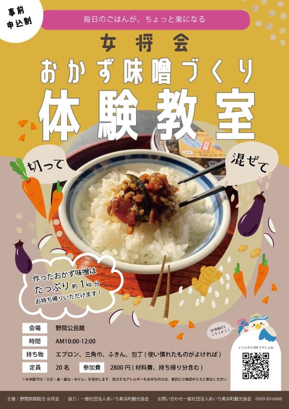 3月4日(水)にあいち美浜町観光協会旅館部の女将さんたちによる、「おかず味噌づくり体験教室」が開催されます!