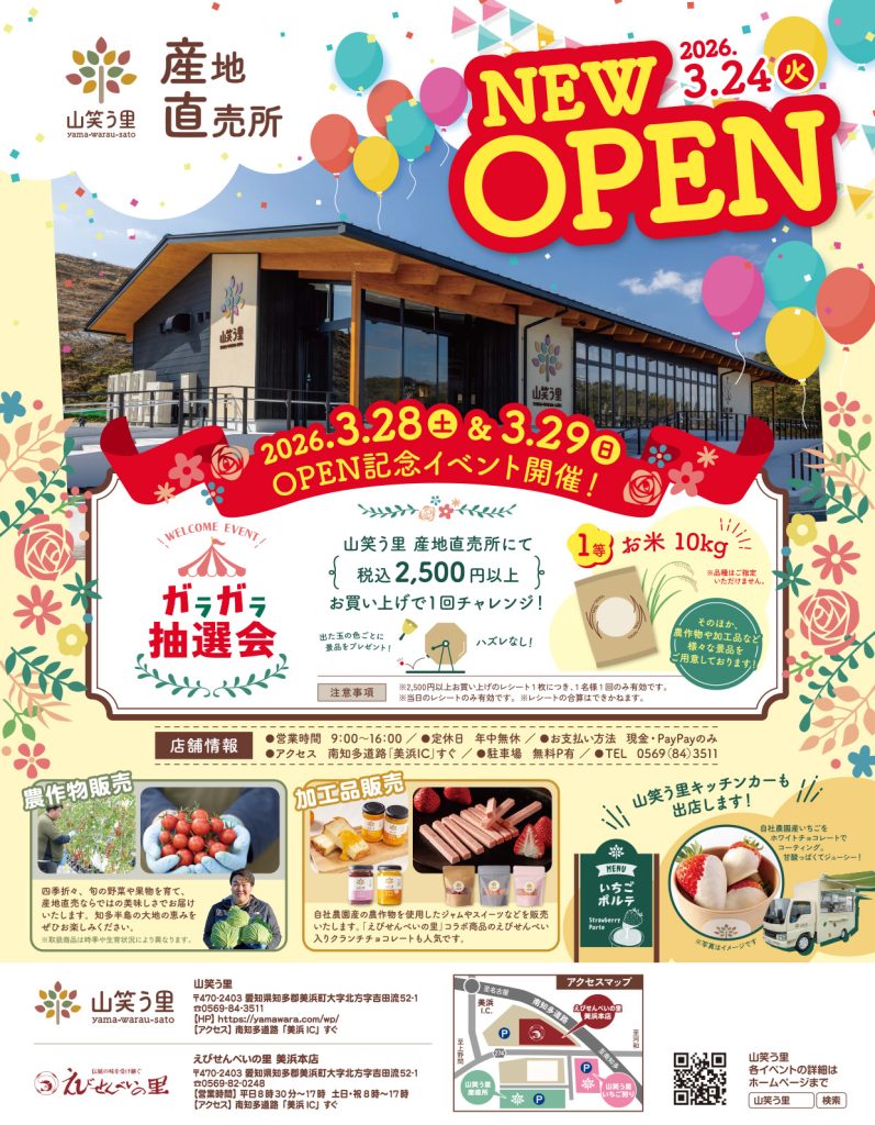 2026年3月24日(火)「山笑う里」の産地直売所が「えびせんべいの里 美浜本店」の道向かいにオープンします!